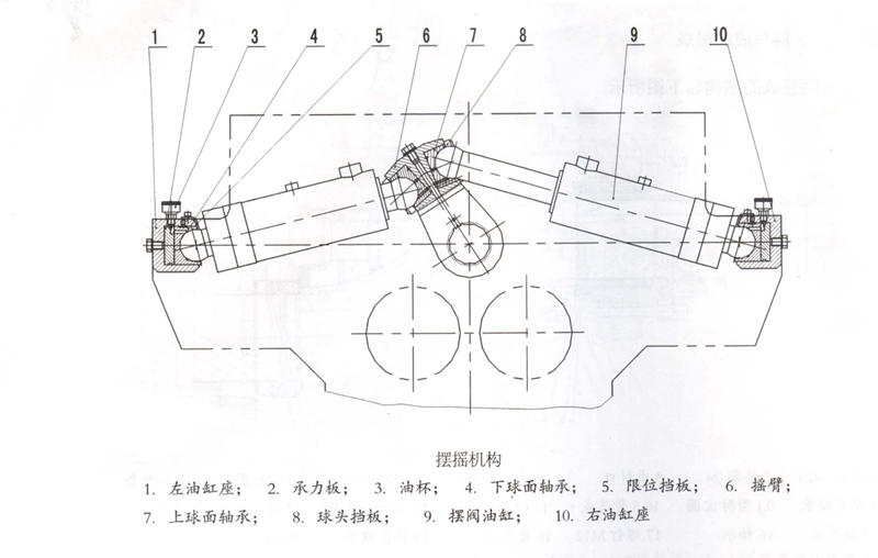 搖擺機構的結構如下圖4所示:它主要由左油缸座1,承力板2,油桿3,下球面軸承4,限位擋板5,搖臂6,上球面軸承7,球頭擋板8,擺閥油缸9,右游缸座10等零部件組成。搖擺機構中擺閥油缸通過液壓系統的控制,保證主油缸的順序動作,驅動搖臂,從而帶動S管,使S管與主油缸協調工作。保證S管的切割環口與泵送的輸送缸為準。