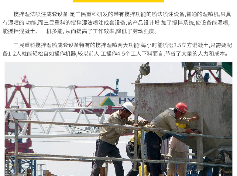 簡介:三民重科攪拌濕噴成套設(shè)備特有的攪拌濕噴兩大功能:每小時(shí)能噴射3.5立方混凝土,只需要配備1-2人就能輕松自如操作機(jī)器,較以前人工操作4-5個(gè)工人下料而言,節(jié)省了大量的人力和成本。