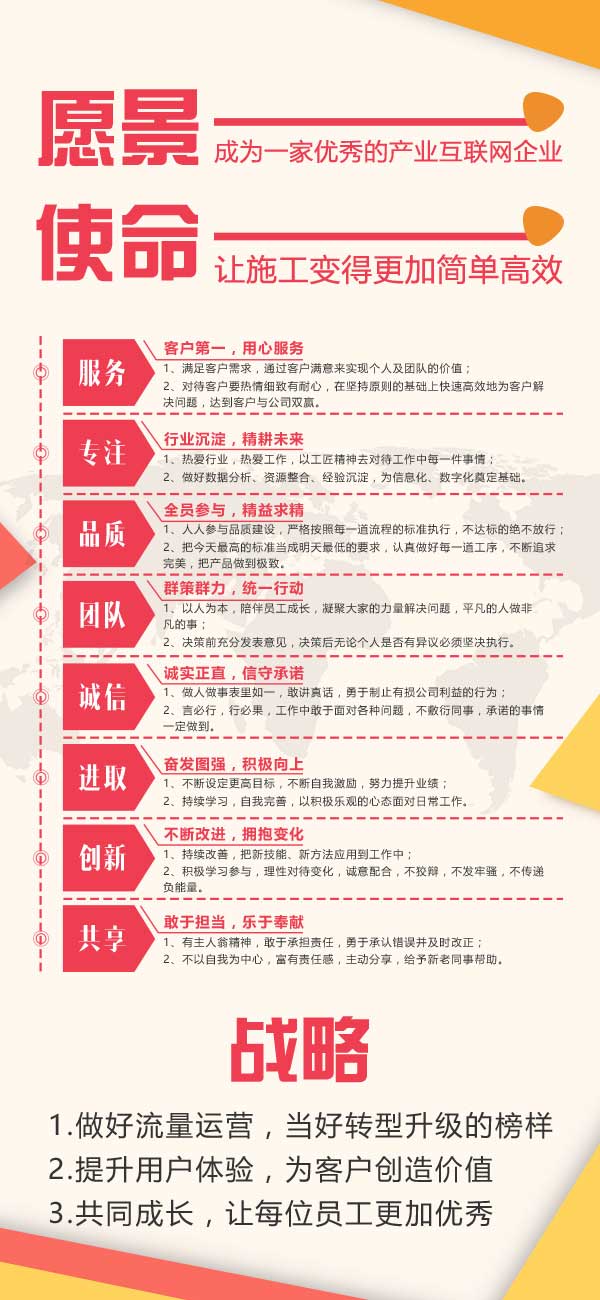 新的企業文化重新定義了愿景、使命、戰略,也進一步強調了核心價值觀的重要性。“成為一家優秀的產業互聯網企業”成為了我們三民重科人的愿景,也是我們共同的夢想。一切圍繞客戶需求,讓我們有了新的使命---“讓施工變得更加簡單高效”,這也是我們的擔當和責任。同時結合我們當下要做的事,調整了公司戰略布局,更加明確了我們前進的方向。