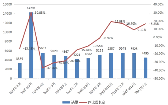工程機械行業的回暖帶動裝載機銷量大增,前瞻產業研究院發布的《中國裝載機行業產銷需求與投資預測分析報告》統計顯示,2017年1月份國內25家主要裝載機生產企業合計銷售各類裝載機共計4495臺,同比大增16.33%。