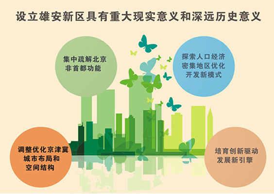 中共中央決定設立雄安新區:設立雄安新區的戰略目標是疏覽北京非首都功能,探索人叔經濟密集地區優化開發新模式,將在河北適合地段規劃建設一座以新發展理念引領的現代新型城區。新區定位綠色智慧新城,打造伓美生態環境,發展高端高新產業,提供優質公共服務,構建快捷高效交通網,推進體制機制改革,擴大全方位對外開放。